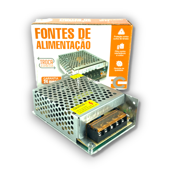 Fonte de alimentação 12v 5a 60w para utilização em sistemas de Segurança Eletrônica e Fitas LED, com proteção contra curto circuito, aquecimento e sobre carga, proporcionando maior segurança. Alimenta até 20 câmeras com IR ligado e consumo máximo de 250 mA*.