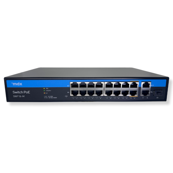 O Switch PoE AI SWP16-M MDX é um equipamento de rede de alto desempenho, com 16 portas PoE 10/100M, 2 uplinks Gigabit e 1 porta SFP, ideal para ambientes que exigem estabilidade, proteção e inteligência. Com tecnologia AI, reconhece automaticamente falhas, permite extensão de rede até 250 metros e garante alimentação de até 60W por porta.